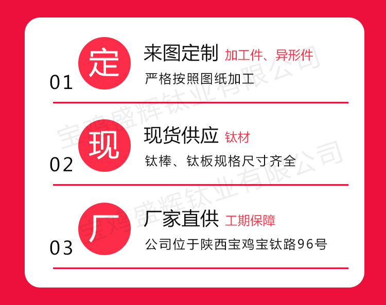 從細(xì)節(jié)出發(fā),站在專業(yè)的角度,始終如一堅(jiān)守品質(zhì)的最終使用價(jià)值,產(chǎn)品和服務(wù)同時(shí)送達(dá)是盛輝鈦業(yè)對客戶的承諾。寶雞盛輝,將以不變的摯誠,用心聆聽,貼心關(guān)懷,以至全至尊的服務(wù),與新老客戶攜手共贏!