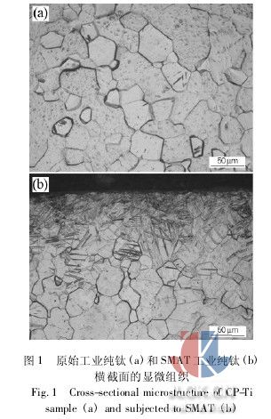 1) 經(jīng)smat處理工業(yè)純鈦表面納米化后,由于表面納米層的細晶強化、高密度位錯和形變孿晶作用可以提高工業(yè)純鈦的硬度。