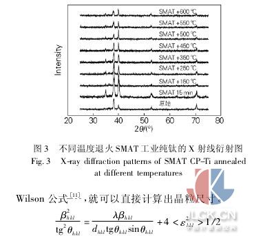 圖3為不同溫度退火smat工業(yè)純鈦的x射線衍射圖。通常認為寬化的bragg衍射峰是由晶粒細化寬化峰、微觀應力寬化峰和儀器寬化峰三者疊加而成。考慮到不同試樣的儀器寬化效應不變,所以根據(jù)β2=β2m-β2s(其中β為由晶粒細化和微觀應變引起的寬化,βm為實測寬化,βs為儀器寬化) 計算實際寬化。x射線衍射儀器寬化由標準sio2標樣校正。由scherrer-wilson公式[11],就可以直接計算出晶粒尺寸。