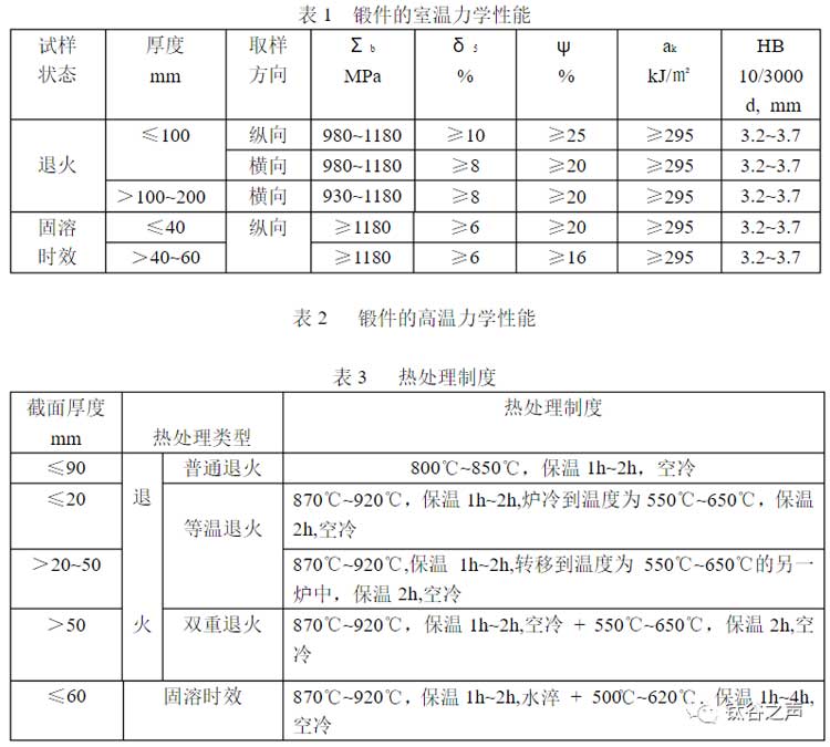 3.4.1 鍛件退貨狀態(tài)的室涅力學性能和高溫力學性能應分別符合表1和表2的規(guī)定。鍛件固溶時效狀態(tài)的室溫力學性能應符合表1的規(guī)定。訂購方要求測定固溶時效力學性能時,應在合同中注明。鍛件推薦的熱處理制度應符合表3的規(guī)定。