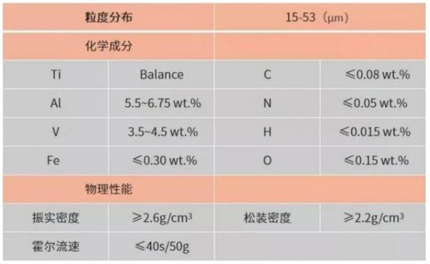 TC4是航空航天、醫(yī)療領(lǐng)域中廣泛使用的一種鈦合金材料。鉑力特TC4粉末通過(guò)選區(qū)激光熔化(SLM)增材制造設(shè)備成形后,所得零部件的微觀組織均勻致密、具有快速凝固的特征。打印件抗拉強(qiáng)度、屈服強(qiáng)度、延伸率分別高于鍛件指標(biāo)約6~7%、6~10%、55-60%。其中,15~53μm TC4粉末的技術(shù)指標(biāo)如下表。