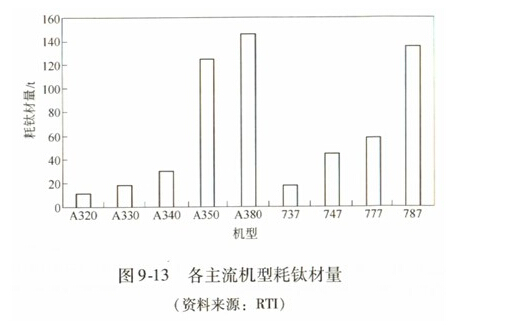 世界航空航天(包括商用和軍工)占到了鈦制品需求10%以上的份額。目前,中國航空航天領域鈦的消費量僅占10%。隨著中國大飛機計劃的實施,鈦在航空航天領域的應用、將迎來大的發展。2009~2028年,中國民航業需要新增飛機3770架。各主流機型耗鈦材量如圖9-13所示。