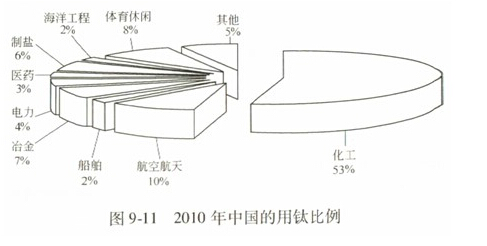 2010年中國鈦及其合金加工材在不同領域的銷售所占比例如圖9-11所示。化工仍是中國用鈦的第一大領域,其用鈦量達到創紀錄的1.97萬噸,占全國總用鈦量的53.2%。