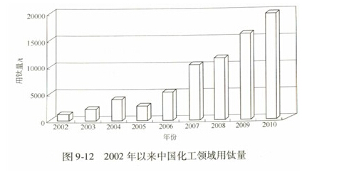 2002年以來中國化工領域用鈦量如圖9-12所示。化工用鈦量最大的行業是氯堿業,占總用量的50%,其次是堿業占20%,塑料占17%,有機化工占10%,無機化工占3%。在各種用鈦的化工設備中換熱器用鈦最多,占鈦材用量的52%;其次為陽極,占24%;各種容器、管和泵閥占9%,其他占5%。