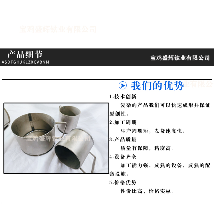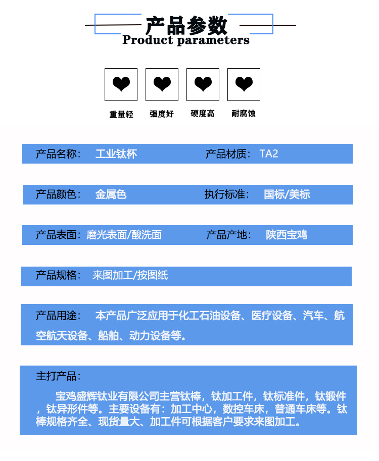 寶雞盛輝鈦業有限公司是一家主要從事鈦及鈦合金棒,鈦環,鈦法蘭及鈦合金板材的高新技術企業,公司提供鈦環,鈦合金棒批發,鈦環的生產工藝服務,以人為本,質量取勝為宗旨:18791863990,18740375975