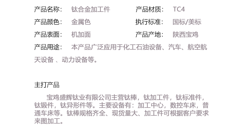 寶雞盛輝鈦業有限公司是一家主要從事鈦及鈦合金棒,鈦環,鈦法蘭及鈦合金板材的高新技術企業,公司提供鈦環,鈦合金棒批發,鈦環的生產工藝服務,以人為本,質量取勝為宗旨:18791863990,18740375975
