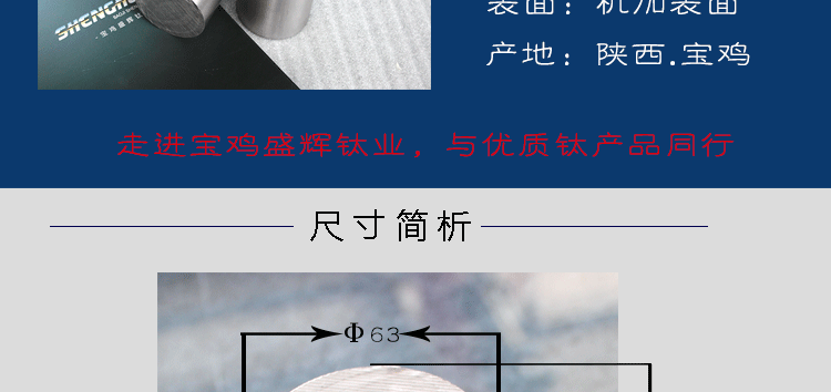 寶雞盛輝鈦業(yè)專業(yè)生產(chǎn)銷售各種規(guī)格的鈦棒,鈦加工件,各類鈦標(biāo)準(zhǔn)件,鈦鍛件,鈦異形件等。主要設(shè)備有:加工中心,數(shù)控車床,普通車床等。設(shè)備齊全,生產(chǎn)能力強,可根據(jù)