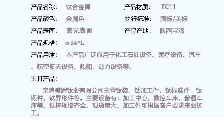 寶雞盛輝鈦業(yè)有限公司主營(yíng)鈦棒,鈦加工件,鈦標(biāo)準(zhǔn)件,鈦鍛件,鈦異