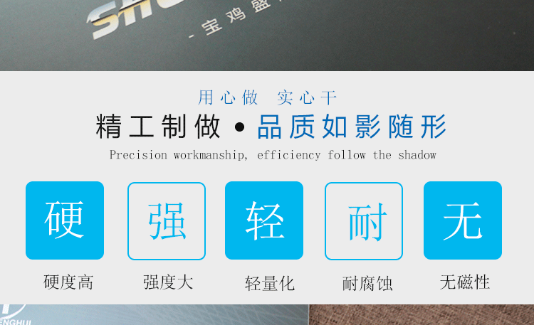 盛輝鈦業鈦產品采用優質的海綿鈦冶煉加工而成,本廠擁有數臺美國全進口四軸哈斯、多臺數控車床以及普通車床、鋸床、焊接平臺等一系列先進的設備,完善的配套設施,滿足不同產品的生產技術要求。產品無論是加工、操作、還是裝配、測試,每一道工序都實施嚴格的質量管理,并符合環保、節能、節約資源的國家戰略,用料絕不含糊,提供高品質的鈦材以及一流的售后服務。