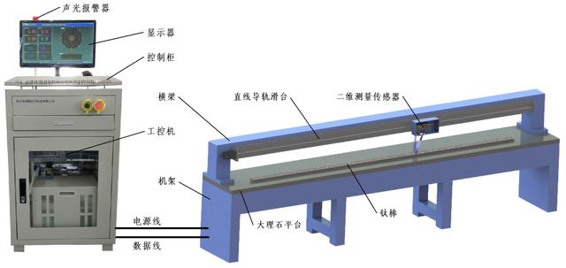 測量儀主要由機架、大理石平臺、橫梁、直線導軌滑臺、二維測量傳感器等組成。檢測時,將鈦棒放入二維測量傳感器的測量區,利用直線導軌滑臺帶動二維測量傳感器對鈦棒進行全程掃描。掃描結果通過數據線傳輸到控制柜內的工控機進行處理、計算,即可得到鈦棒的各位置的直線度誤差,選擇誤差的最大值記為該鈦棒的直線度誤差。當直線度誤差超過設定的公差范圍時,聲光報警器自動聲光報警,達到合格判定的目的。