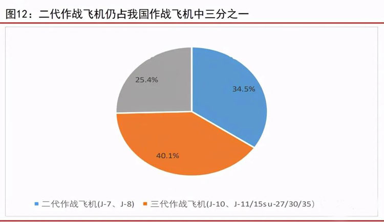 我國仍有三成比例作戰飛機是二代作戰飛機。這里作戰飛機包含有戰斗機、戰斗轟炸機、強擊機、戰略轟炸機等裝備有進攻性武器系統的固定翼戰機。我國作戰飛機中,有 J-7、J-8 二代作戰飛機 561 架,占我國作戰飛機比例高達 34.5%;三代作戰飛機 J-10 有 260 架、J-11/15su-27/30/35 有 391 架,合計 651 架,占我國作戰飛機比例為 40.1%。美國作戰飛機基本上是三代以上作戰飛機,并擁有四代作戰飛機 F-22 178 架,F-35 214 架。二代作戰飛機已經不適合現代戰爭,隨著我國第三代作戰飛機日趨成熟,新型戰機殲-16,殲-10c 以及五代隱身戰斗機殲-20 的相 繼服役,未來二代作戰飛機將逐漸退役。