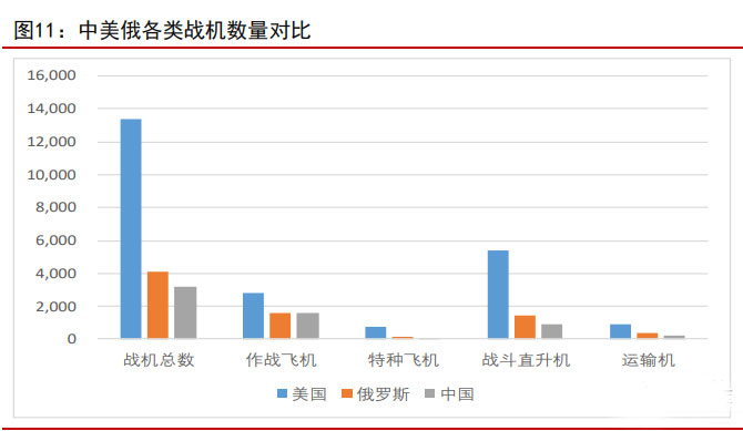 根據《飛行國際》發布的《WorldAirForce2019》,我國現有各類戰機總數 3187 架,美國各類戰機總數 13398 架,俄羅斯各類戰機總數 4078 架。其中我國作戰飛機 1624 架、特種飛機 97 架、戰斗直升機 902 架、運輸機 193 架;美國作戰飛機 2826 架、特種飛機 759 架、戰斗直升機 5429 架、運輸機 940 架;俄羅斯作戰飛機 1591 架、特種飛機 125 架、戰斗直升機 1448 架、運輸機 401 架