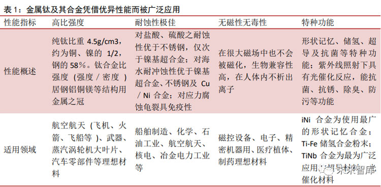鈦具有熔點高、比重小、比強度高、韌性好、抗疲勞、耐腐蝕、導熱系數低、高低溫度耐受性能好、在急冷急熱條件下應力小等特點,其商業價值在二十世紀五十年代開 始被人們認識,鈦多與鐵、鋁、釩或鉬等其他元素造成造出高強度的輕合金,被應用于 航空、航天、軍工等高科技領域。隨著鈦不斷向化工、石油、電力、海水淡化、建筑、 農產食品、醫學、日常生活用品等行業推廣,鈦金屬日益被人們重視,被譽為“第三金屬”、“太空金屬”、“海洋金屬”和“萬能金屬”,因其是提高國防裝備水平不可或缺的重要戰略物資,又被稱為“現代金屬”和“戰略金屬”。