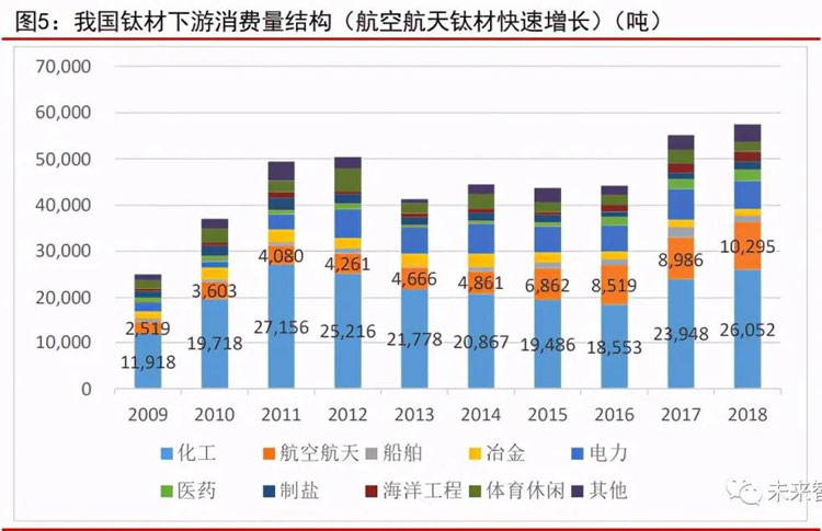近幾年我國航空航天鈦材需求量保持高速增長,根據數據, 2015-2018年航空航天鈦材消費量分別為6862噸、8519噸、8986噸、10295噸,分別同比 增長41%、24%、5%、14.6%。這與我國航空航天高速發展密切相關,運-20量產,太行發動機穩定量產。2018年我國化工鈦材消費量為2.61萬噸,隨著我國航空航天鈦材消費量高速增長,未來有望超過化工領域鈦材消費量。